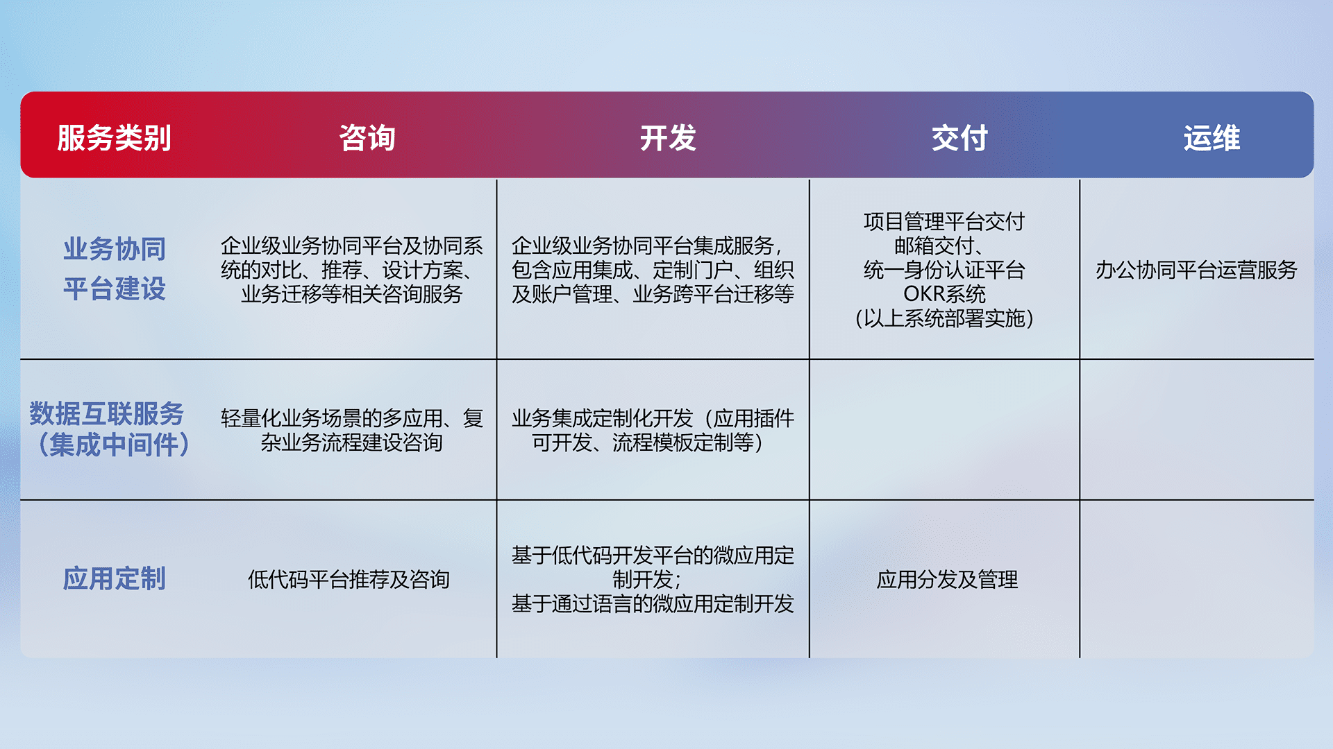 针对钉钉、、、、企微、、、、IDaas等平台级产品提供产品的规划、、方案、、、交付、、定制化开发等服务,,,,实现如统一协同办公、、智能客户服务、、、、混合会议管理、、、、智能数据查询、、、等业务场景,,,,实现数字化转型。。。。